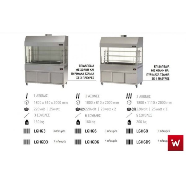 Επιδαπέδια ψησταριά κάρβουνου με σούβλες δύο ατέρμονες και χοάνη και τεσσερις πλευρές τζάμια VKN-LGHGD6 180χ81χ200 εκ