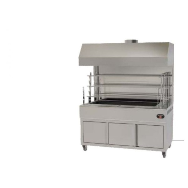 Επιδαπέδια ψησταριά κάρβουνου με σούβλες τρείς ατέρμονες και χοάνη και τρείς πλευρές τζάμια ΙΝΟΧ πίσω VKN-LGHG9 180χ110χ200 εκ