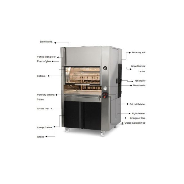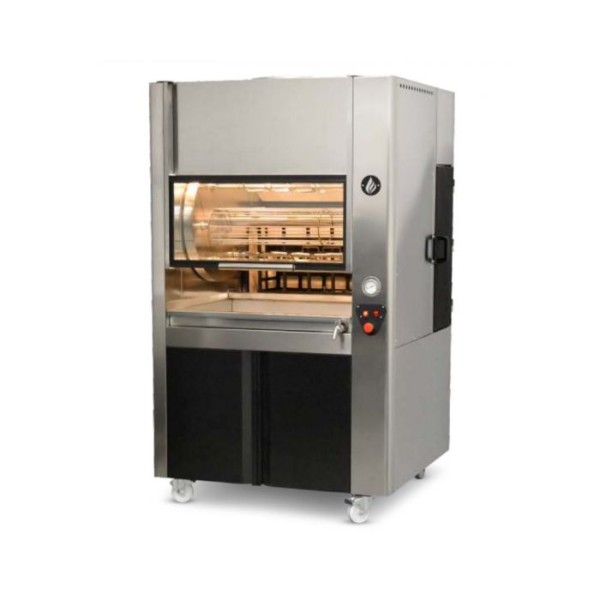 Επιδαπέδια ψησταριά κάρβουνου με σούβλες ένα ατέρμονα και χοάνη και τεσσερις πλευρές τζάμια VKN-LGHGD3 180χ61χ200 εκ