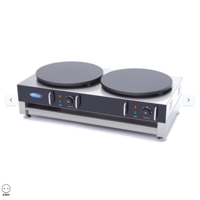 Σε αυτή τη διπλή ηλεκτρική μηχανή για κρέπες μπορείτε να φτιάξετε τις πιο νόστιμες κρέπες, λεπτές γαλλικές τηγανίτες. Οι φρέσκες σπιτικές κρέπες είναι ιδανικές για πρωινό, μεσημεριανό γεύμα, επιδόρπιο ή ως εύκολο σνακ. Το συμπαγές μέγεθος εξασφαλίζει ότι μπορείτε να χρησιμοποιήσετε τη συσκευή παρασκευής κρέπας όχι μόνο στην κουζίνα σας για catering, αλλά και σε ένα περίπτερο κέικ, ένα φορτηγό τροφίμων ή σε έναν πάγκο της αγοράς κατά τη διάρκεια εκδηλώσεων. Υπάρχει ένα συρτάρι αποθήκευσης κάτω από το δίσκο ψησίματος κρέπας, όπου μπορείτε να φυλάξετε τις κρέπες που έχετε φτιάξει. Ο δίσκος ψησίματος έχει βέλτιστη μεταφορά θερμότητας για τη γρήγορη παραγωγή μεγάλων μερίδων κρέπας.