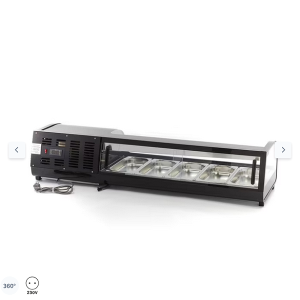 Αυτή η βιτρίνα τάπας επιτραπέζιας χρήσης είναι κατάλληλη τόσο για την παρουσίαση τροφίμων όσο και για τη διατήρηση μιας επιλογής αντικειμένων σε ψύξη. Το καμπύλο γυάλινο παράθυρο και το κομψό μαύρο περίβλημα προσδίδουν σε αυτή τη βιτρίνα μια πολυτελή εμφάνιση. Αυτό την καθιστά κατάλληλη για τοποθέτηση σε έναν πάγκο, ώστε οι επισκέπτες να μπορούν εύκολα να δουν τι προσφέρεται. Η επιτραπέζια βιτρίνα είναι κατάλληλη για την παρουσίαση τάπας, αλλά και για τη διατήρηση πιάτων σούσι και προϊόντων ψαριού δροσερά. Αυτή η επαγγελματική βιτρίνα τάπας μπορεί να χρησιμοποιηθεί σε συνδυασμό με δοχεία GN και παρέχεται με 5 x 1/3 δοχεία GN, έτοιμα προς χρήση.