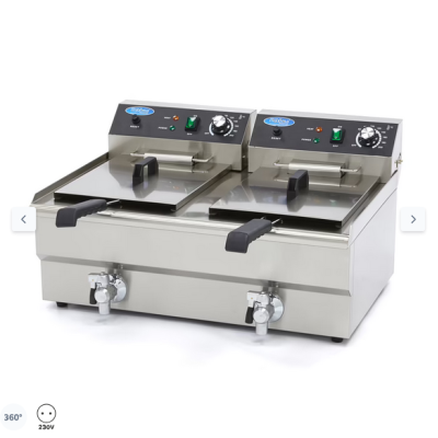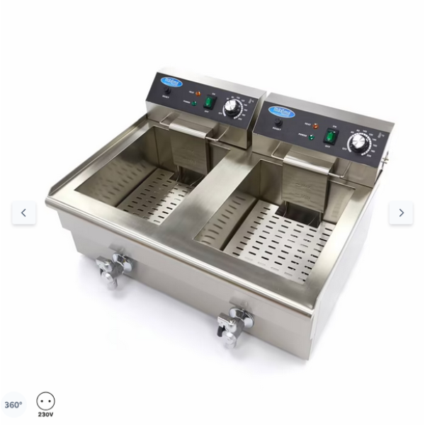 Για την παρασκευή τηγανητών πατατών, σνακ, spring rolls, λαχανικών ή ακόμη και φρούτων: με αυτή την επαγγελματική διπλή φριτέζα, τα προϊόντα βγαίνουν από το λάδι ζεστά και τραγανά. Με διπλή χωρητικότητα δύο ταψιών των 16 λίτρων, οι πελάτες δεν θα χρειαστεί ποτέ να περιμένουν πολύ, ενώ θα ετοιμάζετε ταυτόχρονα διπλάσια σνακ. Η φριτέζα διαθέτει επίσης πόδια από καουτσούκ, ώστε να είναι στιβαρή και σταθερή κατά τη χρήση. Η θερμοκρασία και των δύο θερμαντικών στοιχείων μπορεί να ρυθμιστεί ξεχωριστά, χάρη στον ακριβή θερμοστάτη. Οι θερμοκρασίες μεταξύ 50°C και 200°C μπορούν να ρυθμιστούν στην ακριβή θερμοκρασία που απαιτείται.