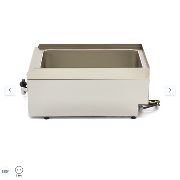 Χάρη στα εξαρτήματά του βαρέως τύπου, το μπεν μαρί είναι κατασκευασμένο για εντατική χρήση. Είναι επίσης ιδανική για χρήση σε μια επαγγελματική γραμμή μαγειρέματος. Το δοχείο νερού είναι κατασκευασμένο από σκληρυμένο ανοξείδωτο ατσάλι και διαθέτει στρογγυλεμένες γωνίες. Μπορείτε να γεμίσετε τη δεξαμενή με νερό χειροκίνητα και, χάρη στη βρύση αποστράγγισης, μπορείτε να αδειάσετε τη δεξαμενή πολύ εύκολα. Ο θερμοστάτης ασφαλείας μπορεί να διαχειριστεί θερμοκρασίες έως και 80ºC. Μόλις σβήσει η ενδεικτική λυχνία, το νερό έχει αποκτήσει θερμοκρασία και μπορείτε να χρησιμοποιήσετε το μπεν μαρί. Αυτή η συσκευή παραδίδεται χωρίς δοχεία GN.