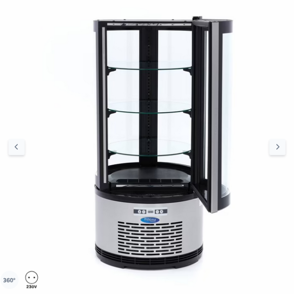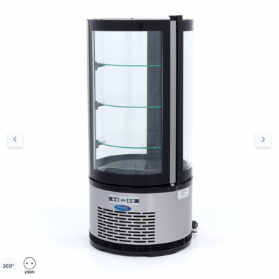 Αυτό το πολυτελώς φινιρισμένο στρογγυλό ψυγείο με χωρητικότητα 100 λίτρων αποτελεί πλεονέκτημα για κάθε αρτοποιείο, εστιατόριο ή επιχείρηση εστίασης. Διαθέτει όμορφα καμπυλωτά παράθυρα περιμετρικά και τρία γυάλινα ράφια που ρυθμίζονται σε ύψος. Σε συνδυασμό με τον ενεργειακά αποδοτικό φωτισμό LED στο εσωτερικό του, τα κέικ, τα γλυκά και άλλα αρτοσκευάσματα βρίσκονται κυριολεκτικά στο επίκεντρο του ενδιαφέροντος. Το πίσω μέρος του στρογγυλού ψυγείου διαθέτει μια βολική ανοιγόμενη πόρτα για να εξυπηρετείτε τους πελάτες γρήγορα και να αναπληρώνετε εύκολα τα προϊόντα.