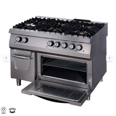 Κάτω από τη σόμπα έξι εστιών υπάρχει ένας ευρύχωρος φούρνος με τριφασικό ρεύμα (400V). Ο στατικός θάλαμος του φούρνου είναι κατασκευασμένος από ανοξείδωτο ατσάλι, με την πόρτα να είναι ιδιαίτερα βαριά με πάχος 40 mm. Στο εσωτερικό του υπάρχει χρωμιωμένη σχάρα με τρία επίπεδα στην οποία μπορείτε να τοποθετήσετε δοχεία 2/1 GN. Μπορείτε να ρυθμίσετε θερμοκρασίες μεταξύ 100 και 300°C. Εκτός από το φούρνο, έχετε επίσης μια πρακτική βάση ντουλαπιού που διαθέτει πόρτα με μαγνητικό κλείσιμο. Εδώ έχετε αρκετό χώρο για να αποθηκεύσετε τακτοποιημένα τα μαγειρικά σκεύη και τα τηγάνια, για παράδειγμα.