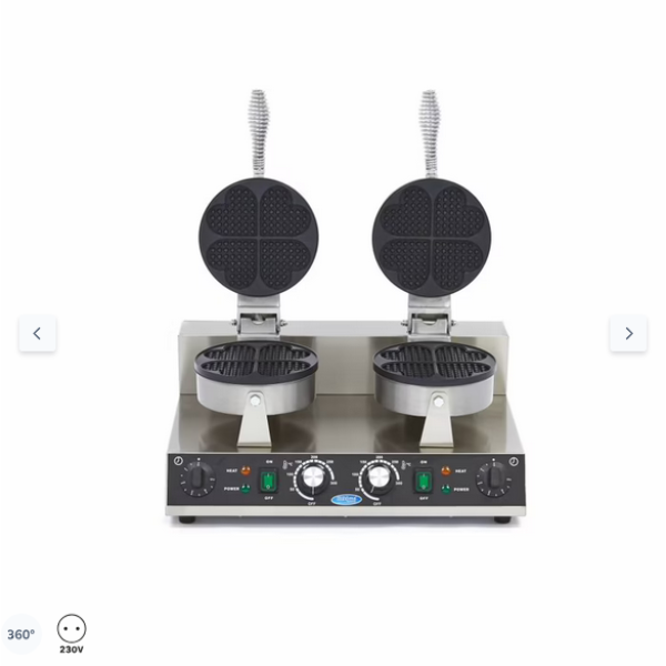 Αυτή η επαγγελματική συσκευή παρασκευής βάφλας σας επιτρέπει να δημιουργείτε τις πιο νόστιμες βάφλες σε σχήμα καρδιάς. Μπορείτε να χρησιμοποιήσετε αυτή τη διπλή βαφλιέρα για να φτιάξετε τέλειες βάφλες σε μια αγορά ή ένα καρναβάλι, αλλά και σε ένα εστιατόριο ή ένα καφέ. Επειδή ο χρόνος είναι πολύτιμος σε μια επαγγελματική κουζίνα, αυτή η συσκευή θα σας βοηθήσει να δημιουργήσετε την τέλεια βάφλα γρήγορα και εύκολα.