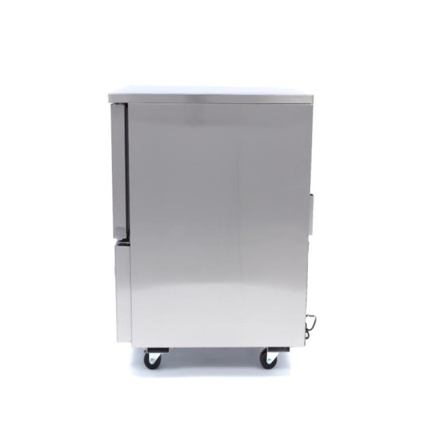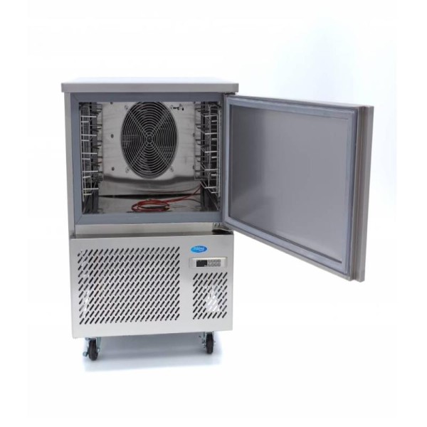 Μόλις τοποθετήσετε τα τρόφιμα σε αυτόν τον επαγγελματικό ψύκτη έκρηξης, αρχίζουν να ψύχονται. Μέσα σε 90 λεπτά, τα τρόφιμα μπορούν να ψυχθούν στους 3ºC και σε περίπου τέσσερις ώρες, αυτά μπορούν να ψυχθούν περαιτέρω και να καταψυχθούν στους -18ºC. Η επιθυμητή θερμοκρασία μπορεί να ρυθμιστεί χρησιμοποιώντας τον έξυπνο ψηφιακό ελεγκτή θερμοκρασίας. Αυτός ο ψύκτης έκρηξης διαθέτει επίσης θερμόμετρο πυρήνα και μπορεί να χρησιμοποιηθεί σε περιβάλλοντα με μέγιστη θερμοκρασία περιβάλλοντος 32ºC. Διατίθεται επίσης με ρόδες για να διευκολύνει τη μεταφορά αυτού του κορυφαίου εξοπλισμού. Διαθέτει αυτοκλειόμενη πόρτα με αντιβακτηριδιακή ελαστική σφράγιση και, στο εσωτερικό του ψύκτη, όλες οι γωνίες έχουν στρογγυλεφθεί για να διευκολύνεται ο ευκολότερος καθαρισμός. Το σύστημα ψύξης αποτελείται από εξατμιστή νερού και το ψυκτικό μέσο που χρησιμοποιείται είναι R290, απαλλαγμένο από CFC. Αυτός ο ψύκτης έκρηξης περιλαμβάνει επίσης μια αυτόματη λειτουργία απόψυξης.