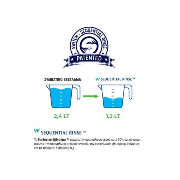 Το διαδοχικό ξέβγαλμα TM μειώνει την κατανάλωση νερού κατά 50% και συνεπώς μειώνει την κατανάλωση απορρυπαντικού , την κατανάλωση ηλεκτρικής ενέργειας και τις εκπομπές άνθρακα (CO2).