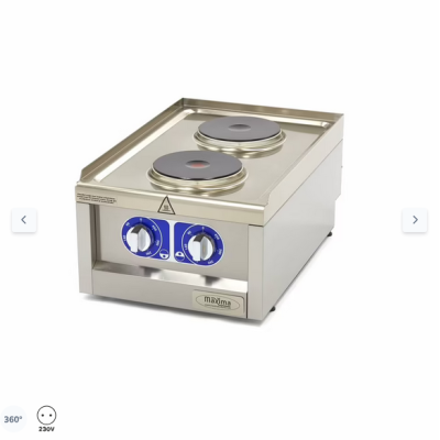 Αυτή η εξαιρετικά ανθεκτική κατασκευή διαθέτει μεγάλα περιστροφικά κουμπιά που λειτουργούν ανεξάρτητα το ένα από το άλλο. Οι εστίες είναι κατασκευασμένες από χυτοσίδηρο, ώστε οι κατσαρόλες και τα τηγάνια που τοποθετούνται στην εστία να θερμαίνονται ομοιόμορφα. Μια εξαιρετικά ισχυρή συσκευή κουζίνας λόγω της μονοκόμματης εστίας. Η συσκευή διαθέτει διακόπτη ασφαλείας για την αποφυγή υπερθέρμανσης. Η θερμοκρασία μπορεί να ρυθμιστεί σε έξι στάδια μεταξύ 90 και 450ºC. Αυτή η κουζίνα διατίθεται επίσης σε μοντέλο με τέσσερις εστίες. Εάν δεν θέλετε να τοποθετήσετε την εστία σε τραπέζι, παραγγείλετε τη βάση από ανοξείδωτο χάλυβα που είναι κατάλληλη για αυτή τη συσκευή.