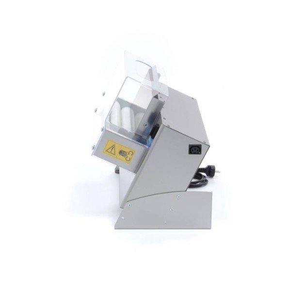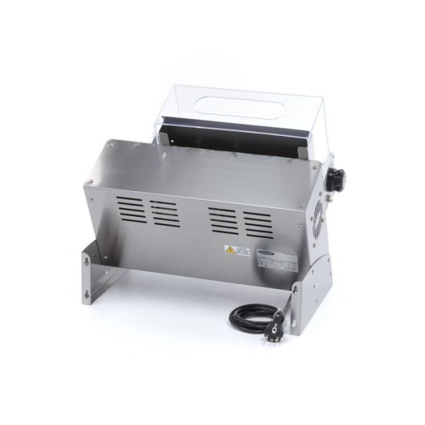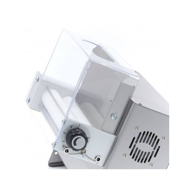 Αυτός ο κύλινδρος μονής φοντάν είναι εξοπλισμένος με ένα ανθεκτικό και ισχυρό μοτέρ. Ο κύλινδρος φοντάν είναι εφοδιασμένος με μία ταχύτητα. Για να εργάζεστε με ασφάλεια με αυτό το μηχάνημα κύλισης φοντάν, διαθέτει διαφανές πλαστικό προστατευτικό κάλυμμα και διακόπτη ασφαλείας. Τα δύο φαρδιά πόδια από ανοξείδωτο ατσάλι παρέχουν καλή σταθερότητα. Το περίβλημα είναι κατασκευασμένο εξ ολοκλήρου από ανοξείδωτο ατσάλι και καθαρίζεται πολύ εύκολα. Μπορείτε να αφαιρέσετε τα διάφορα μέρη από τη συσκευή και να τα σκουπίσετε με ένα στεγνό πανί. Μην χρησιμοποιείτε νερό, καθώς τυχόν υπολείμματα αλευριού μπορεί να κολλήσουν στη συσκευή.