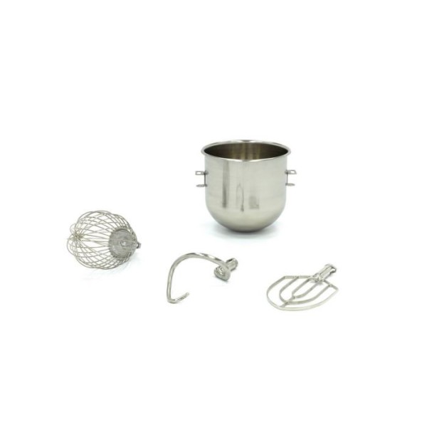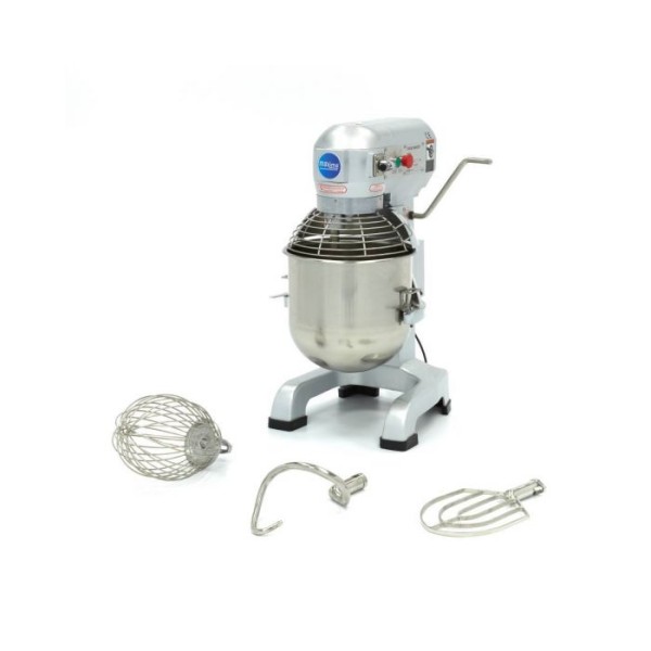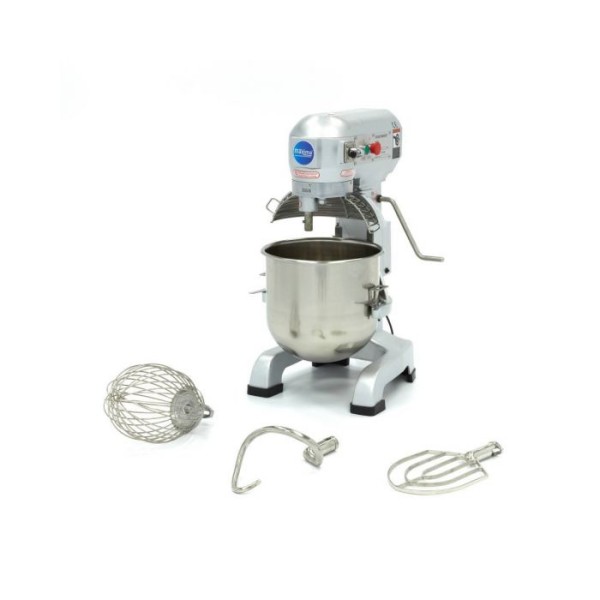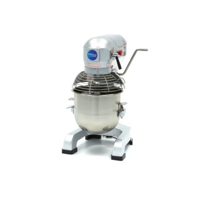 Αυτό το στιβαρό πλανητικό μίξερ είναι εξοπλισμένο με ένα ανθεκτικό μπολ ανάμιξης από ανοξείδωτο χάλυβα 20L. Το χτύπημα, το ζύμωμα και η ανάμειξη μπορούν να γίνουν σε τρεις διαφορετικές ταχύτητες: 105, 180 και μέγιστη ταχύτητα 408 στροφών ανά λεπτό. Με το περιλαμβανόμενο σύρμα, το χτύπημα των ασπράδι αυγού είναι μια εύκολη υπόθεση. Σε αυτό το επαγγελματικό πλανητικό μίξερ περιλαμβάνονται τόσο ένας γάντζος ζύμης όσο και ένα φτερό ζύμης. Τα μεταλλικά γρανάζια εξασφαλίζουν αβίαστο ζύμωμα και ανάμειξη κάθε είδους ζύμης και ζυμαριού. Αυτό το υψηλής ποιότητας μίξερ ζύμης είναι εύκολο στη λειτουργία, χάρη στα ξεχωριστά κουμπιά εκκίνησης και διακοπής.