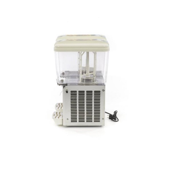 Αυτός ο διανομέας ποτών διαθέτει μοντέρνο και κομψό σχεδιασμό, καθιστώντας τον μια ξεχωριστή προσθήκη σε κάθε χώρο εστίασης. Το περίβλημα και η λαβή από ανοξείδωτο ατσάλι όχι μόνο προσθέτουν στην αισθητική του, αλλά εξασφαλίζουν επίσης εύκολη συντήρηση και καθαριότητα. Με την αθόρυβη λειτουργία της, αυτή η συσκευή είναι ιδανική για μεγάλους χώρους εστίασης ή θορυβώδεις κουζίνες. Ο μηχανισμός συνεχούς ανάδευσης διατηρεί το περιεχόμενο της δεξαμενής καλά αναμεμειγμένο για βέλτιστα αποτελέσματα. Μπορείτε να ρυθμίσετε τη θερμοκρασία μεταξύ 7 και 12°C χρησιμοποιώντας τον θερμοστάτη και θα παραμείνει σταθερή. Το σύστημα ψύξης λειτουργεί με τη χρήση ψυκτικού υγρού R290.