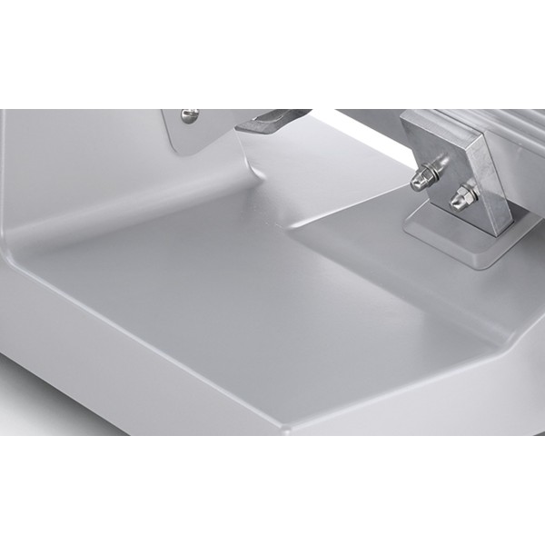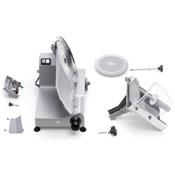 Σώμα από βαμμένο αλουμίνιο. - Εξαρτήματα από ανοδιωμένο αλουμίνιο. - Εργονομική πρέσα τροφίμων από χυτό αλουμίνιο με δόντια διαμορφωμένα για να εμποδίζουν καλύτερα το προϊόν να κοπεί. - Ευρύς χώρος μεταξύ του κινητήρα και της λεπίδας για εύκολο καθάρισμα. - Αεριζόμενος κινητήρας για συνεχή εργασία. - Φορείο που κινείται σε αυτολιπαινόμενους δακτυλίους και καρφίτσες με επικάλυψη. - Χυτευτό σώμα ακονιστηρίου με 2 τυπικούς τροχούς σμύριδας. - Συμπαγείς διαστάσεις αλλά μεγάλη ικανότητα κοπής. - Σχεδιασμός για την απελευθέρωση του φορείου στην έκδοση CE. - Κλίση λεπίδας 25°.