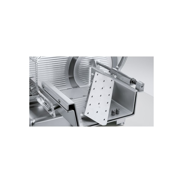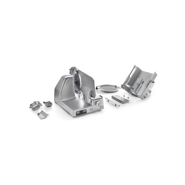 Στρογγυλεμένος σχεδιασμός και χωρίς αιχμηρές άκρες ή ορατές βίδες. - Το μέγεθος μπορεί να χωρέσει τραπέζι βάθους 70 cm - Λεπίδα χαμηλού προφίλ μειωμένης τριβής - Επιχρωμιωμένη τροχισμένη και επικαλυμμένη ράβδος ολίσθησης. - Ομαλή ολίσθηση χάρη στους επικαλυμμένους σιδερένιους δακτυλίους - Επικαλυμμένος δακτύλιος ράβδου ολίσθησης από χυτοσίδηρο. - Βουλκανισμένα λαστιχένια στοπ στο φορείο. - Εκτροπέας φετών από ανοξείδωτο ατσάλι. - Ερμητική τροχαλία - Τροχαλία λεπίδας χωρίς κεντρική οπή για εύκολο καθάρισμα. - Η ρυθμιζόμενη κίνηση του τραπεζιού κοπής στα πρώτα 3 mm του ανοίγματος, εγγυάται υψηλότερη ακρίβεια κοπής λεπτών φετών. - Εύκολα αφαιρούμενο κάλυμμα λεπίδας - Βίδες και εξαρτήματα από ανοξείδωτο ατσάλι. - Ενσωματωμένο εργαλείο ακονίσματος με προστασία κάτω μέρους. - Εύκολη αφαίρεση του προστατευτικού λίπους. - Τυπικό εργαλείο αφαίρεσης λεπίδας. - Απόσταση 70 mm μεταξύ λεπίδας και κινητήρα. - Κουμπιά αλουμινίου. - Τηλεσκοπικά πόδια αλουμινίου με βάση από καουτσούκ. - Κουμπιά από ανοξείδωτο ατσάλι με βαθμό προστασίας IP67. - Κιτ εργαλείων συντήρησης και CD επίδειξης.