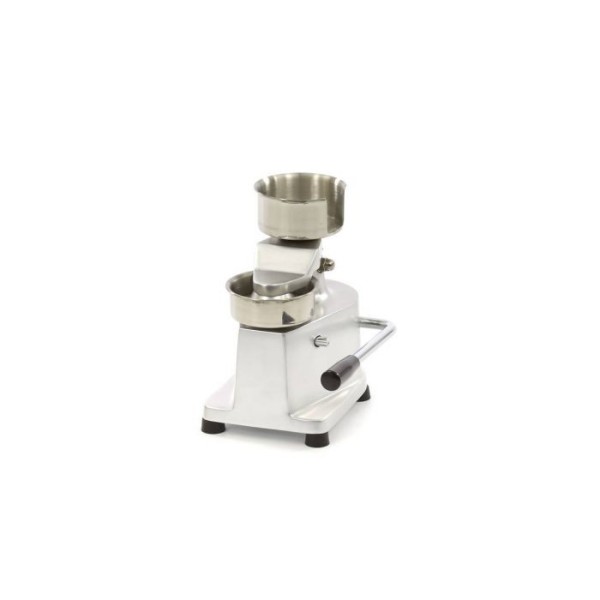 Αυτό το εύχρηστο και συμπαγές επιτραπέζιο μοντέλο είναι εξοπλισμένο με μοχλό και λειτουργεί εξ ολοκλήρου χειροκίνητα. Αυτό σας επιτρέπει να χρησιμοποιείτε την πρέσα για χάμπουργκερ οπουδήποτε στην κουζίνα. Η πλάκα, η λαβή και οι υποδοχές είναι κατασκευασμένα από ανοξείδωτο ατσάλι και καθαρίζονται εύκολα. Τα ξεχωριστά μέρη μπορούν να καθαριστούν στο πλυντήριο πιάτων. Βεβαιωθείτε ότι όλα τα μέρη είναι στεγνά πριν συναρμολογήσετε ξανά την πρέσα χάμπουργκερ. Τα λαστιχένια πόδια παρέχουν επιπλέον σταθερότητα. Η πρέσα χάμπουργκερ παρέχεται με 500 φύλλα μερίδας.
