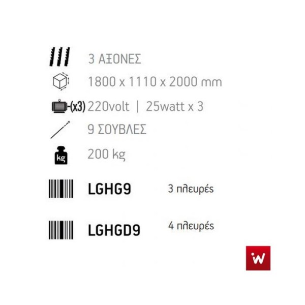 Επιδαπέδια ψησταριά κάρβουνου με σούβλες τρείς ατέρμονες και χοάνη και τρείς πλευρές τζάμια ΙΝΟΧ πίσω VKN-LGHG9 180χ110χ200 εκ