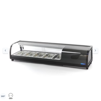 Αυτή η βιτρίνα τάπας επιτραπέζιας χρήσης είναι κατάλληλη τόσο για την παρουσίαση τροφίμων όσο και για τη διατήρηση μιας επιλογής αντικειμένων σε ψύξη. Το καμπύλο γυάλινο παράθυρο και το κομψό μαύρο περίβλημα προσδίδουν σε αυτή τη βιτρίνα μια πολυτελή εμφάνιση. Αυτό την καθιστά κατάλληλη για τοποθέτηση σε έναν πάγκο, ώστε οι επισκέπτες να μπορούν εύκολα να δουν τι προσφέρεται. Η επιτραπέζια βιτρίνα είναι κατάλληλη για την παρουσίαση τάπας, αλλά και για τη διατήρηση πιάτων σούσι και προϊόντων ψαριού δροσερά. Αυτή η επαγγελματική βιτρίνα τάπας μπορεί να χρησιμοποιηθεί σε συνδυασμό με δοχεία GN και παρέχεται με 5 x 1/3 δοχεία GN, έτοιμα προς χρήση.