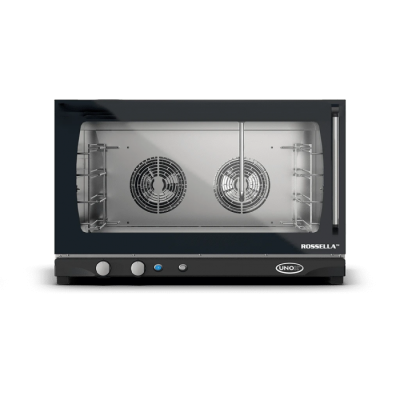Φούρνος Convention με υγρασία, αναλογικό έλεγχο και θάλαμο μαγειρέματος από ανοξείδωτο χάλυβα 304. Λειτουργία χρόνου, θερμοκρασίας, ποσοστού ατμού και 2 ταχυτήτων ανεμιστήρα. Ιδανικός για όλες τις διαδικασίες ψησίματος φρέσκων και κατεψυγμένων αρτοσκευασμάτων. Η τεχνολογία AIR.Plus εγγυάται τέλεια ομοιομορφία μαγειρέματος σε όλα τα ταψιά.