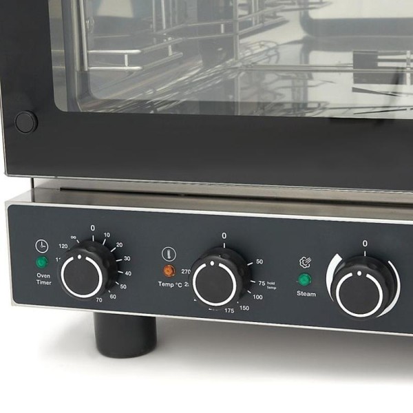 Αυτός ο συνδυαστικός φούρνος ατμού είναι ιδανικός για να μαγειρεύετε με συνέπεια. Τα ισχυρά θερμαντικά στοιχεία από ανοξείδωτο ατσάλι εξασφαλίζουν τόσο πλήρη όσο και αποτελεσματική κατανομή θερμότητας. Επιπλέον, ο φούρνος συνδυασμένου ατμού είναι εξοπλισμένος με ανεμιστήρα με αντίστροφη λειτουργία και διπλό αθερμικό τζάμι. Η πόρτα ρυθμίζεται πολύ εύκολα, ενώ η σφράγιση της πόρτας είναι κατασκευασμένη από σιλικόνη ποιότητας τροφίμων. Στον ευανάγνωστο πίνακα ελέγχου, θα βρείτε ένα κουμπί για τον ατμό, τη θερμοκρασία και το χρονοδιακόπτη. Διαθέτει μεγάλο εύρος θερμοκρασίας, ώστε να μπορείτε να μαγειρέψετε σχεδόν τα πάντα. Περιλαμβάνει επίσης χρονοδιακόπτη που σας επιτρέπει να την αφήσετε να μαγειρέψει, ενώ εσείς συνεχίζετε με άλλες εργασίες. Τέλος, το κουμπί ατμού σας επιτρέπει να ρυθμίσετε το ακριβές ποσοστό ατμού που επιθυμείτε.