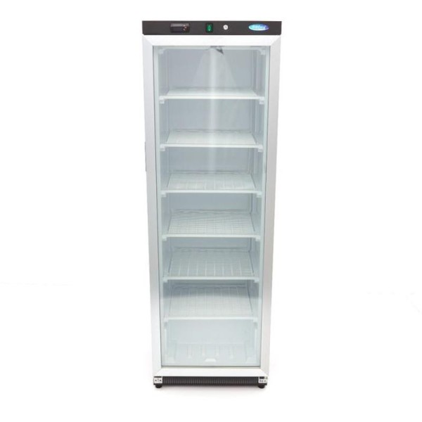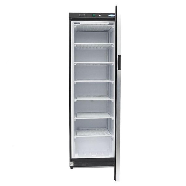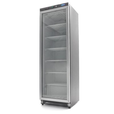 Αυτός ο επαγγελματικός καταψύκτης έχει μικτή χωρητικότητα 400 λίτρων για την αποθήκευση κατεψυγμένων προϊόντων. Αυτός ο μαύρος καταψύκτης ταιριάζει άψογα στις περισσότερες επαγγελματικές κουζίνες. Διαθέτει έξι σταθερά ράφια που παρέχουν επαρκή αποθηκευτικό χώρο. Τα ράφια είναι σχεδιασμένα σε μοτίβο πλέγματος για να βελτιώνουν τον εξαερισμό. Η γυάλινη πόρτα περιλαμβάνει κλειδαριά που σας επιτρέπει να βλέπετε τα κατεψυγμένα προϊόντα χωρίς να ανοίγετε το ψυγείο.