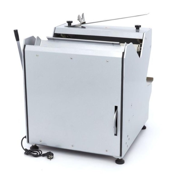Αυτός ο κόφτης ψωμιού είναι απλός στη χρήση. Αρχικά, ενεργοποιήστε το μηχάνημα χρησιμοποιώντας το κουμπί On. Για να ρυθμίσετε το μέγεθος πάχους της τροφοδοσίας, τοποθετήστε πρώτα το ψωμί στη μέση της μηχανής. Στη συνέχεια, τραβήξτε το μοχλό προς το μέρος σας για να σπρώξετε το ψωμί μέσα στη μηχανή. Στο επάνω μέρος της μηχανής, υπάρχει μια πλάκα πρέσας. Αυτή η πλάκα πρέσας ρυθμίζει αυτόματα το ύψος της ώστε να ταιριάζει με το ύψος του ψωμιού. Το ψωμί θα κοπεί σε ομοιόμορφα χοντρά κομμάτια και θα βγει από την άλλη πλευρά της μηχανής. Οι λεπίδες θα σταματήσουν όταν ο μοχλός πιεστεί εντελώς προς τα εμπρός. Στην έξοδο, υπάρχουν εύκαμπτα πτερύγια που εξασφαλίζουν ότι οι χαλαρές φέτες παραμένουν μαζί. Στο κάτω μέρος της μηχανής υπάρχει ένας δίσκος ψίχας, ο οποίος μπορεί εύκολα να αφαιρεθεί και να αδειάσει. Για να συσκευάσετε τις φέτες ψωμιού, μπορείτε να χρησιμοποιήσετε το μεταλλικό καρότσι συσκευασίας και να το εφοδιάσετε με μια πλαστική ή χάρτινη σακούλα ψωμιού. Αυτός ο κόφτης ψωμιού δεν είναι κατάλληλος μόνο για κανονικό ψωμί, αλλά μπορεί επίσης να κόψει σε φέτες σκληρό ψωμί, όπως μπαγκέτες.