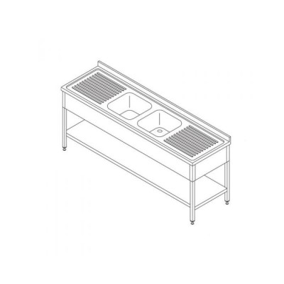 Αυτό το τραπέζι πλυντηρίου πιάτων έχει διαστάσεις 190 x 70 cm και όχι μόνο περιλαμβάνει δύο νεροχύτες και ένα τμήμα αποστράγγισης, αλλά διαθέτει επίσης προστατευτικό πιτσιλίσματος 6 cm για να προστατεύει τον τοίχο από ζημιές από το νερό. Εμποδίζει το νερό να τρέχει στο πίσω μέρος, όπου δεν μπορεί να καθαριστεί εύκολα. Αυτό αποτρέπει τυχόν συσσώρευση νερού στους τοίχους και βοηθά στην καθοδήγηση του νερού προς τα κάτω στο νεροχύτη, όπου μπορεί να αποστραγγιστεί.