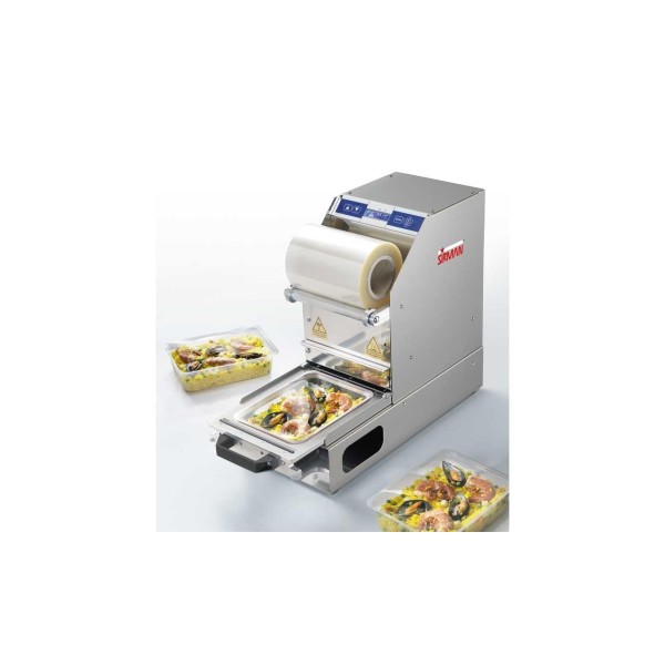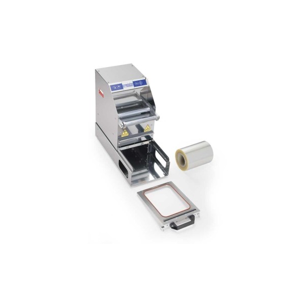Πρακτικό και στιβαρό αυτόματο θερμοκολλητικό μηχάνημα - Δομή από ανοξείδωτο ατσάλι - Διαθέτει μηχανοκίνητη πλάκα στεγανοποίησης αλουμινίου με επικάλυψη τεφλόν, η οποία καθοδηγείται σε 4 σημεία για ομοιόμορφη σφράγιση σε ολόκληρη την επιφάνεια. - Ρυθμιζόμενη θερμοκρασία και χρόνος σφράγισης. - Ηλεκτρονικός έλεγχος με καταμέτρηση δίσκων - Το δοχείο μπορεί επίσης να κατασκευαστεί σύμφωνα με τις προδιαγραφές του πελάτη - Πλήρως αφαιρούμενο συρτάρι με αισθητήρα για αυτόματη ενεργοποίηση του κύκλου σφράγισης - Το μηχάνημα μπορεί επίσης να χρησιμοποιηθεί για τη σφράγιση πολύ ψηλών δίσκων που χρησιμοποιούνται σε καταστήματα ντελικατέσεν κ.λπ. - Αυτόματη κοπή της μεμβράνης. - Διατίθενται μήτρες στην τυπική έκδοση ή κατασκευασμένες σύμφωνα με το σχέδιο του πελάτη. Επιλογές: - Μεμβράνη επικάλυψης δίσκου - Στάνταρ δίσκοι mm 137x95 h.63 mm 190x137 h.72 mm 230x190 h.65 mm 260x190 h.65 - Καλούπια των διαθέσιμων δίσκων.