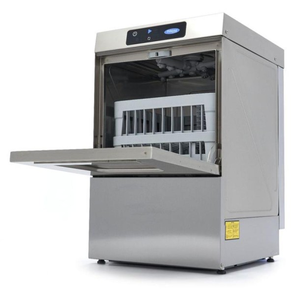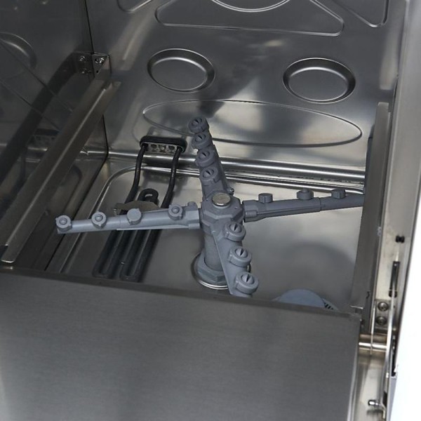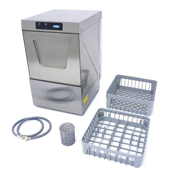 Αυτό το πλυντήριο πιάτων είναι ιδιαίτερα οικονομικό, καθώς καταναλώνει μόνο 2,5 λίτρα νερού ανά κύκλο. Προσφέρει χαρακτηριστικά ασφαλείας, όπως θερμική προστασία και προστασία IPX5 για τον πίνακα ελέγχου. Είναι επίσης εύκολος ο χειρισμός του μηχανήματος με ένα μόνο κουμπί για την πλήρωση και τη θέρμανση του νερού στο δοχείο του λέβητα. Ο ψηφιακός διακόπτης πίεσης για το δοχείο πλύσης επιτρέπει την εύκολη ρύθμιση της στάθμης του νερού, ενώ ο αισθητήρας NTC ελέγχει τον θερμοστάτη. Τα πιάτα πλένονται στους 55-60°C και ξεπλένονται στους 80-85°C, με αποτέλεσμα να στεγνώνουν γρηγορότερα. Μπορείτε να επιλέξετε να προθερμάνετε το νερό ή να ξεκινήσετε με κρύο πλύσιμο. Τέσσερις ενδεικτικές λυχνίες δείχνουν την κατάσταση της πλήρωσης, της θέρμανσης, της πλύσης και της διάρκειας του προγράμματος. Το πλυντήριο πιάτων παράγει έναν ήχο μόλις ολοκληρωθεί ο κύκλος. Διατίθεται με ένα καλάθι γυαλιού 40 x 40 cm, ένα καλάθι πιάτων 40 x 40 cm, ένα καλάθι μαχαιροπίρουνων και έναν εύκαμπτο σωλήνα παροχής και αποστράγγισης για τη σύνδεση με την παροχή νερού. Το πλυντήριο πιάτων περιλαμβάνει αντλία έκπλυσης, αλλά όχι αντλίες σαπουνιού και αποστράγγισης. Τέσσερα ρυθμιζόμενα πόδια επιτρέπουν την εύκολη προσαρμογή του ύψους.