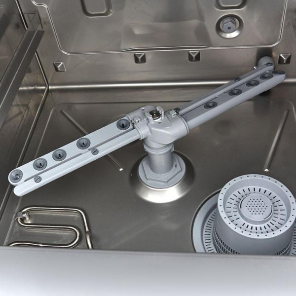 Με κατανάλωση 2,8L νερού ανά κύκλο, πρόκειται για ένα πολύ οικονομικό πλυντήριο πιάτων. Είναι επίσης ασφαλές στην εργασία, χάρη στη θερμική προστασία. Ο πίνακας ελέγχου είναι προστατευμένος κατά IPX4, ώστε το νερό να μην μπαίνει πίσω από τα κουμπιά. Είναι επίσης εύκολο στη χρήση: υπάρχει ένα μόνο κουμπί On/Off, ένα δεύτερο κουμπί για την εκκίνηση/διακοπή του κύκλου πλύσης και ένα τρίτο κουμπί για τη ρύθμιση του επιθυμητού προγράμματος πλύσης. Τρεις ενδεικτικές λυχνίες δείχνουν πότε το πλυντήριο πιάτων είναι έτοιμο να ξεκινήσει και πότε βρίσκεται σε εξέλιξη το πρόγραμμα ξεβγάλματος. Τα πιάτα πλένονται στους 60°C και ξεπλένονται στους 85°C, ώστε να στεγνώνουν γρήγορα. Αυτό το πλυντήριο πιάτων συνοδεύεται από ένα καλάθι γυαλιού 50 x 50 cm, ένα καλάθι πιάτων 50 x 50 cm, ένα καλάθι μαχαιροπίρουνων και έναν σωλήνα παροχής και αποστράγγισης για τη σύνδεση της συσκευής με την παροχή νερού. Αυτό το πλυντήριο πιάτων διαθέτει αντλία αποστράγγισης, καθώς και αντλίες σαπουνιού και βοηθητικού ξεβγάλματος.
