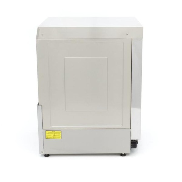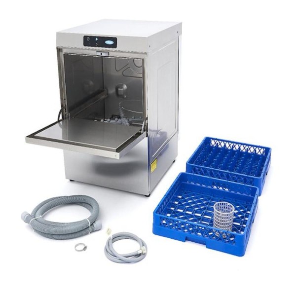 Αυτό το πλυντήριο πιάτων είναι ιδιαίτερα οικονομικό, καθώς καταναλώνει μόνο 2,8 λίτρα νερού ανά κύκλο. Προσφέρει χαρακτηριστικά ασφαλείας, όπως θερμική προστασία και προστασία IPX5 για τον πίνακα ελέγχου. Είναι επίσης εύκολος ο χειρισμός του μηχανήματος με ένα μόνο κουμπί για την πλήρωση και τη θέρμανση του νερού στη δεξαμενή μπόιλερ. Ο ψηφιακός διακόπτης πίεσης για το δοχείο πλύσης επιτρέπει την εύκολη ρύθμιση της στάθμης του νερού, ενώ ο αισθητήρας NTC ελέγχει τον θερμοστάτη. Τα πιάτα πλένονται στους 55-60°C και ξεπλένονται στους 80-85°C, με αποτέλεσμα να στεγνώνουν γρηγορότερα. Μπορείτε να επιλέξετε να προθερμάνετε το νερό ή να ξεκινήσετε με κρύο πλύσιμο. Τέσσερις ενδεικτικές λυχνίες δείχνουν την κατάσταση της πλήρωσης, της θέρμανσης, της πλύσης και της διάρκειας του προγράμματος. Το πλυντήριο πιάτων παράγει έναν ήχο μόλις ολοκληρωθεί ο κύκλος. Διατίθεται με ένα καλάθι γυαλιού 50 x 50 cm, ένα καλάθι πιάτων 50 x 50 cm, ένα καλάθι μαχαιροπίρουνων και έναν εύκαμπτο σωλήνα παροχής και αποστράγγισης για τη σύνδεση με την παροχή νερού. Το πλυντήριο πιάτων περιλαμβάνει αντλία έκπλυσης, αλλά όχι αντλίες σαπουνιού και αποστράγγισης. Τέσσερα ρυθμιζόμενα πόδια επιτρέπουν την εύκολη προσαρμογή του ύψους.