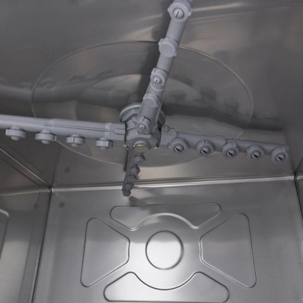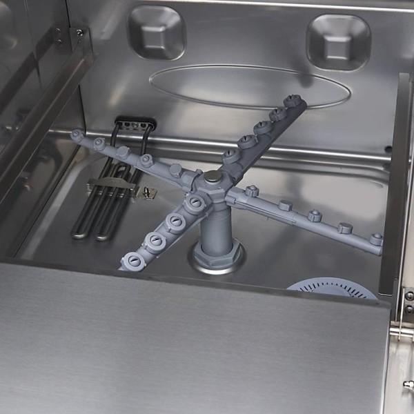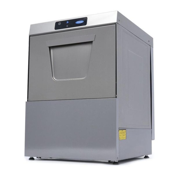 Αυτό το πλυντήριο πιάτων είναι ιδιαίτερα οικονομικό, καθώς καταναλώνει μόνο 2,8 λίτρα νερού ανά κύκλο. Προσφέρει χαρακτηριστικά ασφαλείας, όπως θερμική προστασία και προστασία IPX5 για τον πίνακα ελέγχου. Είναι επίσης εύκολος ο χειρισμός του μηχανήματος με ένα μόνο κουμπί για την πλήρωση και τη θέρμανση του νερού στη δεξαμενή μπόιλερ. Ο ψηφιακός διακόπτης πίεσης για το δοχείο πλύσης επιτρέπει την εύκολη ρύθμιση της στάθμης του νερού, ενώ ο αισθητήρας NTC ελέγχει τον θερμοστάτη. Τα πιάτα πλένονται στους 55-60°C και ξεπλένονται στους 80-85°C, με αποτέλεσμα να στεγνώνουν γρηγορότερα. Μπορείτε να επιλέξετε να προθερμάνετε το νερό ή να ξεκινήσετε με κρύο πλύσιμο. Τέσσερις ενδεικτικές λυχνίες δείχνουν την κατάσταση της πλήρωσης, της θέρμανσης, της πλύσης και της διάρκειας του προγράμματος. Το πλυντήριο πιάτων παράγει έναν ήχο μόλις ολοκληρωθεί ο κύκλος. Διατίθεται με ένα καλάθι γυαλιού 50 x 50 cm, ένα καλάθι πιάτων 50 x 50 cm, ένα καλάθι μαχαιροπίρουνων και έναν εύκαμπτο σωλήνα παροχής και αποστράγγισης για τη σύνδεση με την παροχή νερού. Το πλυντήριο πιάτων περιλαμβάνει αντλία έκπλυσης, αλλά όχι αντλίες σαπουνιού και αποστράγγισης. Τέσσερα ρυθμιζόμενα πόδια επιτρέπουν την εύκολη προσαρμογή του ύψους.