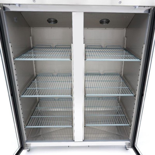 Τα φρέσκα υλικά και τα τρόφιμα που έχουν ήδη παρασκευαστεί πρέπει να διατηρούνται στο ψυγείο, ώστε να διαρκούν περισσότερο. Αυτό το ψυγείο από ανοξείδωτο χάλυβα, με μικτή χωρητικότητα 1200 λίτρων, προσφέρει αυξημένες δυνατότητες ψύξης για την επιχείρησή σας εστίασης. Το εσωτερικό του διαθέτει ενεργειακά αποδοτικό φωτισμό LED και έξι ράφια ρυθμιζόμενου ύψους που είναι κατάλληλα για δοχεία 2/1 GN. Οι γυάλινες πόρτες με αντιβακτηριδιακή ελαστική σφράγιση περιλαμβάνουν ενσωματωμένη κλειδαριά και σας επιτρέπουν να βλέπετε τα ψυχόμενα προϊόντα χωρίς να ανοίγετε το ψυγείο.