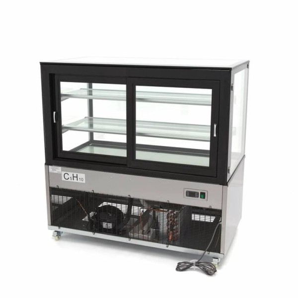 Ένας καλός φούρνος, μια μπρασερί ή μια καφετέρια χρειάζεται μια ψυχόμενη βιτρίνα για να διατηρεί τα τρόφιμα δροσερά. Αυτή η βιτρίνα ζαχαροπλαστικής από μαύρο και ανοξείδωτο ατσάλι αποπνέει πολυτέλεια και είναι κατάλληλη για να παρουσιάσετε τα προϊόντα σας με ελκυστικό τρόπο. Τα σνακ, τα αρτοσκευάσματα και τα κέικ είναι ευδιάκριτα χάρη στον ενσωματωμένο ενεργειακά αποδοτικό φωτισμό LED στο εσωτερικό της. Η ψυχόμενη βιτρίνα διαθέτει γυάλινα τοιχώματα και πόρτα και είναι εξοπλισμένη με δύο γυάλινα ράφια που ρυθμίζονται σε ύψος. Στο πίσω μέρος του ψυγείου βιτρίνας υπάρχει συρόμενη γυάλινη πόρτα για εύκολη πρόσβαση στα προϊόντα που εκτίθενται.