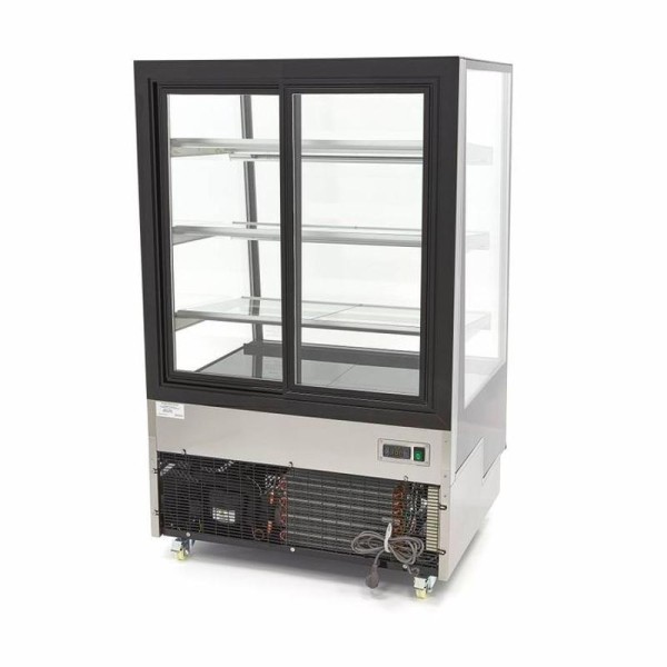 Αυτή η βιτρίνα είναι ιδανική για χρήση σε εστιατόρια, ξενοδοχεία, καφετέριες και άλλα καταστήματα εστίασης. Εκτός από τα κέικ και τα αρτοσκευάσματα, η πολυτελής βιτρίνα -με χωρητικότητα 400 λίτρων- προσφέρει αρκετό χώρο για άλλα τρόφιμα, όπως σάντουιτς, σαλάτες, τάπας και σνακ. Η ψυκτική βιτρίνα είναι εξοπλισμένη με γυάλινα παράθυρα περιμετρικά και τρία γυάλινα ράφια στο εσωτερικό της, τα οποία ρυθμίζονται σε ύψος. Προσφέρει έναν πολυτελή τρόπο για να παρουσιάσετε επαγγελματικά όλα τα προϊόντα σας στους επισκέπτες και τους πελάτες σας. Στο πίσω μέρος της βιτρίνας υπάρχει συρόμενη πόρτα, ώστε ο ανεφοδιασμός και το σερβίρισμα να γίνονται εύκολη υπόθεση.