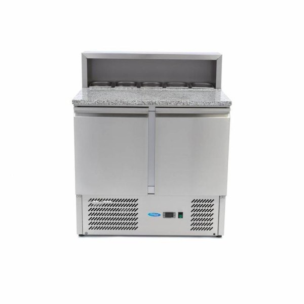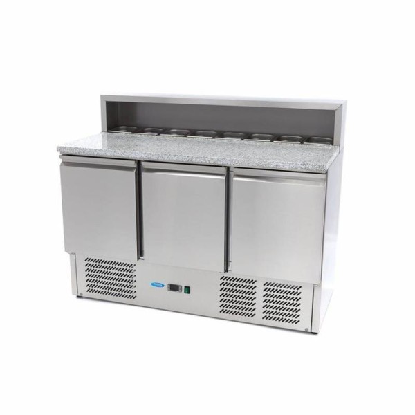 Αν ετοιμάζετε καθημερινά φρέσκες πίτσες με τις πιο νόστιμες γαρνιτούρες, τότε αυτός ο όμορφος, ψυχόμενος σταθμός προετοιμασίας είναι απαραίτητος για την κουζίνα σας. Ο γρανιτένιος πάγκος αυτού του ψυγείου προετοιμασίας πίτσας σημαίνει ότι η ζύμη δεν κολλάει και μπορεί να ανοίξει και να είναι έτοιμη για χρήση. Χάρη στην ψυχόμενη βιτρίνα που είναι τοποθετημένη στο επάνω μέρος, μπορείτε να είστε σίγουροι ότι όλες οι αγαπημένες σας γαρνιτούρες όχι μόνο βρίσκονται σε απόσταση αναπνοής αλλά και ότι παραμένουν δροσερές μέχρι το τελευταίο δευτερόλεπτο. Αυτή η κορυφαία συσκευή κουζίνας συνοδεύεται επίσης από ανοξείδωτα στηρίγματα για τη συγκράτηση των δοχείων GN, αν και τα δοχεία και τα καπάκια δεν περιλαμβάνονται. Μπορείτε να τα παραγγείλετε ξεχωριστά μέσω του διαδικτυακού καταστήματος.