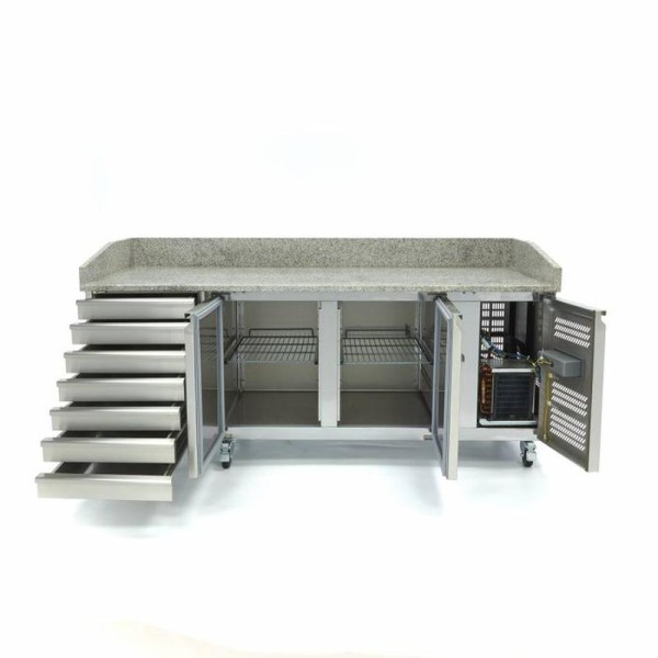 Αν ετοιμάζετε καθημερινά φρέσκες πίτσες με τις πιο νόστιμες γαρνιτούρες, τότε αυτός ο όμορφος, ψυχόμενος σταθμός προετοιμασίας είναι απαραίτητος για την κουζίνα σας. Ο πάγκος από γρανίτη αυτού του ψυγείου προετοιμασίας πίτσας σημαίνει ότι η ζύμη δεν κολλάει και μπορεί να ανοίξει και να είναι έτοιμη για χρήση. Χάρη στην ψυχόμενη γυάλινη βιτρίνα που είναι τοποθετημένη στο επάνω μέρος, όλες οι δημοφιλείς γαρνιτούρες σας είναι όχι μόνο ορατές αλλά και παραμένουν δροσερές μέχρι το τελευταίο δευτερόλεπτο. Αυτή η premium συσκευή κουζίνας συνοδεύεται επίσης από ανοξείδωτα στηρίγματα για τη συγκράτηση των δοχείων GN, αν και τα δοχεία και τα καπάκια δεν περιλαμβάνονται. Αυτά μπορείτε να τα παραγγείλετε ξεχωριστά μέσω του διαδικτυακού καταστήματος.