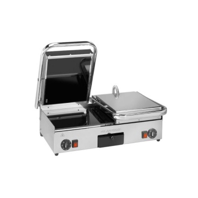 Επαγγελματική τοστιέρα με χοντρές γυάλινες κεραμικές πλάκες μαγειρέματος με υψηλή θερμική αντοχή και δομή από ανοξείδωτο χάλυβα που εγγυάται μεγάλη διάρκεια ζωής, μεγάλη επιφάνεια ψησίματος και πολύ υψηλή ταχύτητα θέρμανσης χάρη στα ισχυρά υπέρυθρα στοιχεία (πάνω από 300°C σε 3 λεπτά) για μεγαλύτερη απόδοση κατά το μαγείρεμα.