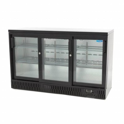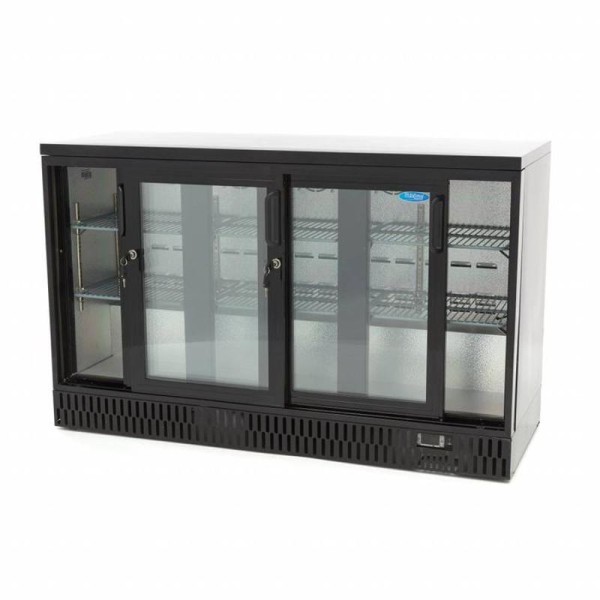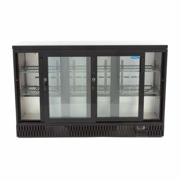 Για να παρουσιάσετε ποτά και σνακ επαγγελματικά, διατηρώντας τα παράλληλα δροσερά, χρειάζεστε αυτό το πολυτελές, μαύρο ψυγείο ποτών. Έχει χωρητικότητα 323 λίτρων και διαθέτει τρεις συρόμενες πόρτες για εύκολη πρόσβαση. Αυτές είναι διπλού υαλοπίνακα για να διατηρούν τα προϊόντα απόλυτα δροσερά μέχρι να τα χρειαστείτε. Όλες οι πόρτες διαθέτουν κλειδαριά για να κλείνει εντελώς το ψυγείο. Πίσω από κάθε πόρτα υπάρχουν δύο ρυθμιζόμενα ράφια, ώστε να μπορείτε να προσαρμόσετε τη διάταξη ανάλογα με τις ανάγκες σας. Για να αναδεικνύονται ακόμη καλύτερα τα προϊόντα στο ψυγείο ποτών, διαθέτει ενσωματωμένο φωτισμό LED.