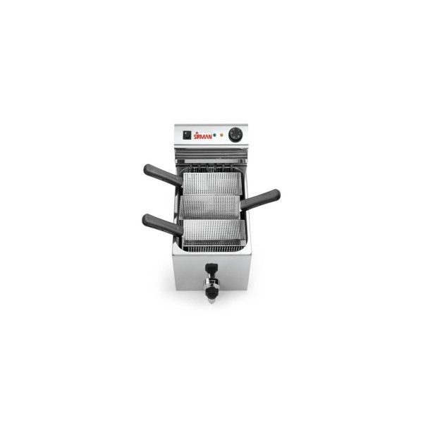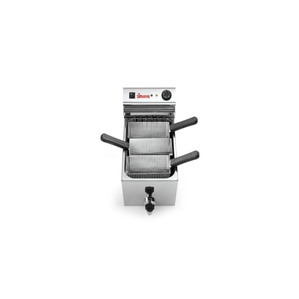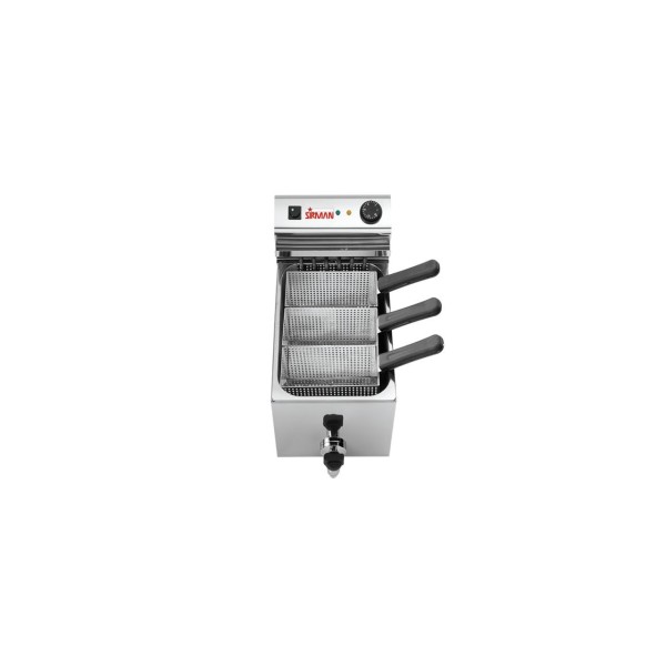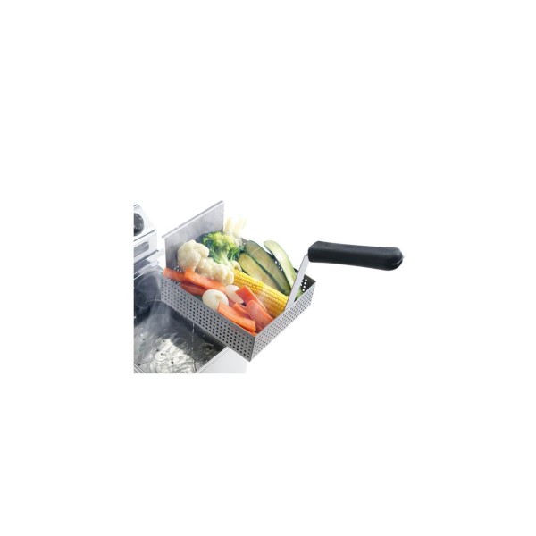 • Δομή και δεξαμενή από ανοξείδωτο ατσάλι • Καλάθι με μικροτρύπες από ανοξείδωτο ατσάλι με εύχρηστη λαβή. • Ειδικοί θωρακισμένοι αντιανεμικοί θερμαντήρες • Διακόπτης ελέγχου θερμοκρασίας • Θερμομονωτικό ασφαλείας. • Στάνταρ χαρακτηριστικό: βρύση εξόδου νερού. Προαιρετικά: • Καλάθι μαγειρέματος στον ατμό (mm 200x220 h.60).